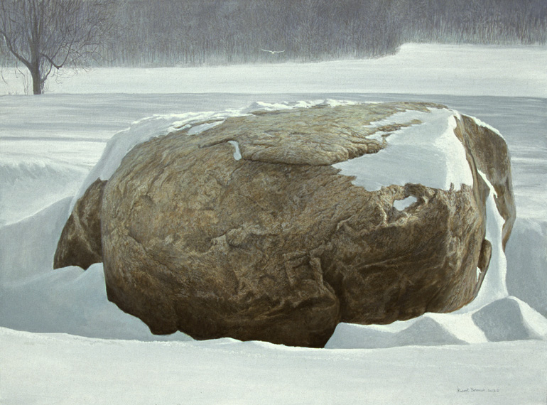 This is a very special boulder to me. It is a glacial erratic which was my turnaround point on my daily hikes when I lived in Ontario. I would often do some meditating while I touched the rock. Through the years this place and this rock achieved some spiritual qualities. I imagined the snowy owl [which like the erratic is from the north] coming to perch on the boulder.