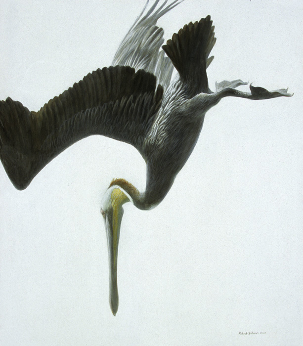 - This painting composition was inspired by the abstract expressionist Franz Kline and also the awkward, tumbling figure painting of Robert Longo. The pose is the slightly out-of-control contortions the pelican makes in the split second transition from a great, flapping bird into a diving javelin.