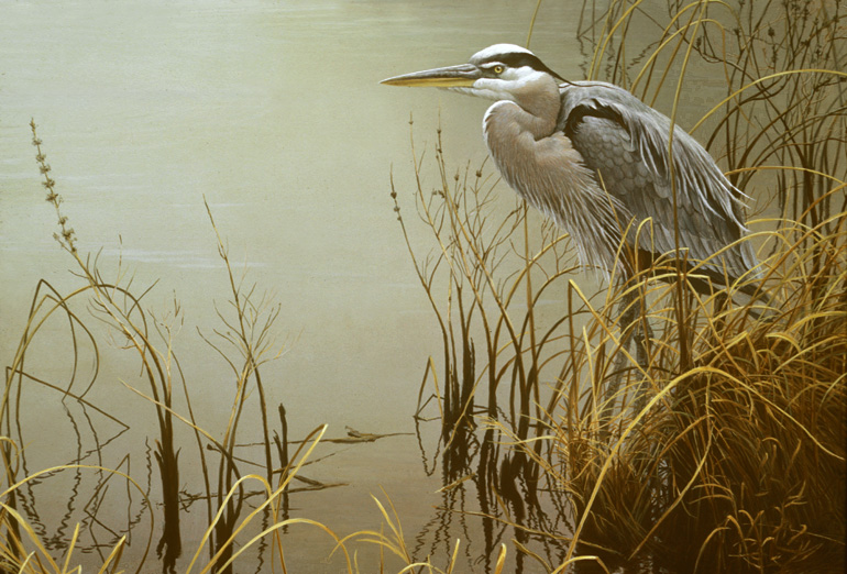 This elegant bird is the largest of the heron family. Over half of its length is the head and neck, a well designed javelin system. The gracefully folded neck can straighten with lightning speed aimed at a luckless frog or fish. With a toss of the head, the prey is swallowed and the hunting pose is resumed. So motionless is this pose, that the heron resembles a painting on a Japanese screen, or goes unnoticed altogether. Many times I have paddled around a curve in a river to be startled by a croaking squawk. The heron inevitabley sees me first and takes off on great wings which spread as wide as I am tall. When taking flight, the neck is streteched out but is folded back as the cruising speed is reached. Herons are mistakenly called cranes by some people, but the much rarer cranes fly with necks outstretched.
