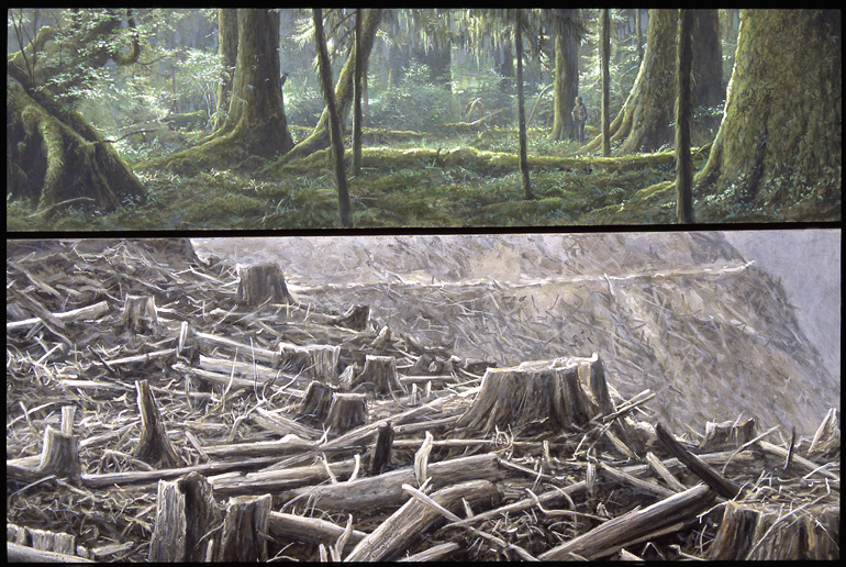 - On our way to the valley we passed through areas that had already been cut down. Their appearance was shocking; nothing was left but stumps. In contrast to this scene of desolation is the lush, old-growth rain forest of the top panel. The human figure (me) is present to give some idea of the scale of the trees, but also to say that although humans do threaten these forests, there are many people working to preserve them.