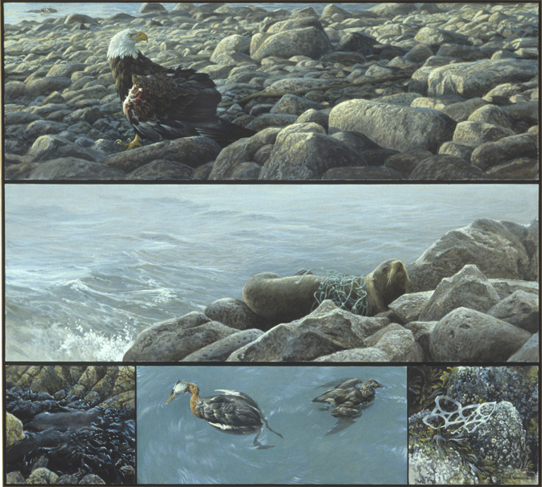 bottom [l to r]: oil slick; red-necked grebe & rhinoceros auklet; plastic six-pack ring