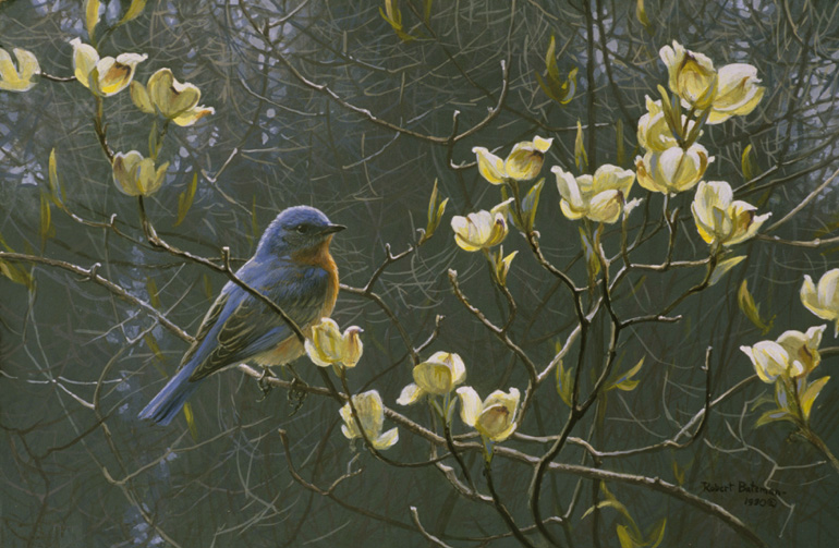 In the early spring, you can look through the forest and see the blossoms of the dogwood like glowing beacons or candles, particularly when the sun shines through and they are backlit. This is the primary effect I wanted to achieve in this painting.