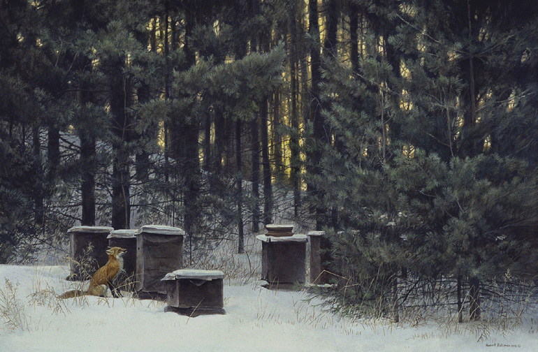 - A Dutchman in our neighbourhood asked if he could place some of his beehives in the shade of the pines at the corner of the meadow. We got an annual bucket of excellent honey in the bargain. In the painting, the hives are wrapped in tar paper for the winter.