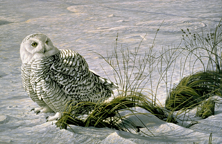 I have portrayed this owl at the end of the day in the rich glow preceding sunset. White light is made up of all the colours of the spectrum. On a winter evening, these colours seem to separate and radiate a shimmer of every hue. I have echoed the bounds and curves of the grasses in the form of the bird and in the wind-sculpted snow.