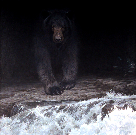 We saw this bear at fairly close range on the shore of a quiet river. We were in a canoe. He was surrounded by bright green and yellow sunlit foliage. I decided to show him in a simple Rothko-like black rectangle with a narrow band of white water beneath.