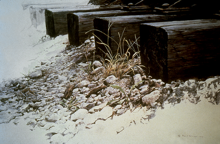 The delicacy of this little killdeer contrasts with the heavy power of the railway ties and tracks, yet it fits perfectly into this man-made environment, as does the young dandelion.