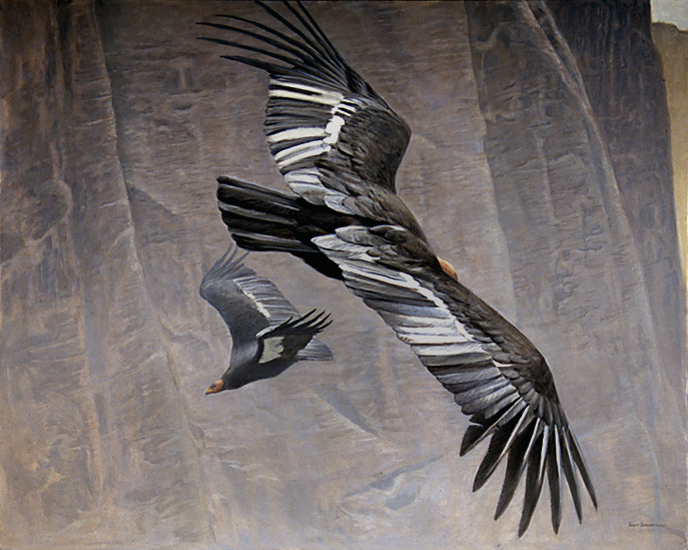 The California condor is the greatest master of the air with a wingspread of nine feet. However, it has perhaps the ugliest face of any bird . . . so I showed the vast wings and tried to give a feeling of the profound spaces of the Grand Canyon where they have been recently reintroduced into the wild.