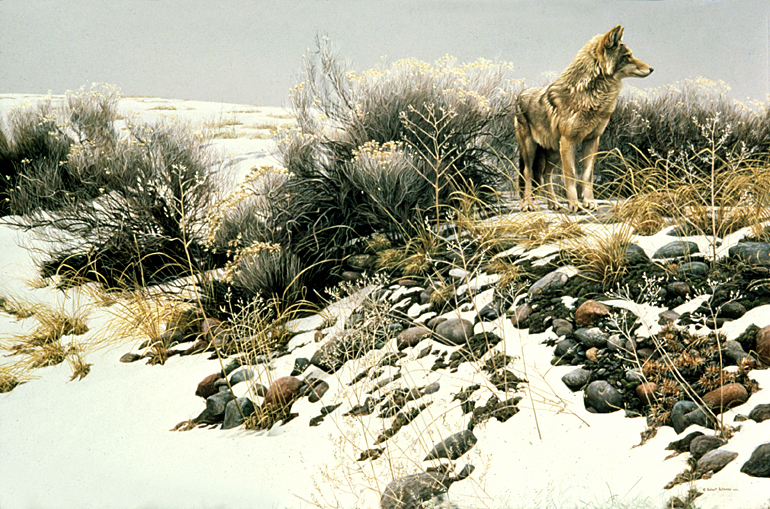 The coyote, or brush wolf, is our North American wild dog. He is standing on an old glacial gravel ridge, among winter sagebrush. I enjoyed the austere colors and rich textures and forms.