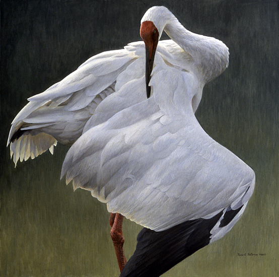 The International Crane Foundation in Baraboo, Wisconsin plans to use the image in this painting in posters published in 8 or 9 different Asian languages -- Russian, Chinese, Hindi, Urdu, Farsi, Uzbeki, Afghana-yi and others. They plan to display these posters in towns and villages throughout the distribution area of the Siberian cranes. The western population is down to about 10 birds, the central population has been reduced to 2. The eastern population of approximately 2500 birds is threatened by the Three Gorges Dam in China. These magnificent birds are the Asian equivalent of the whooping crane. With international efforts and of course financing, the good news story of the whooping cranes could be repeated. At one point their numbers were down to 14 and now there are 300-350 birds.