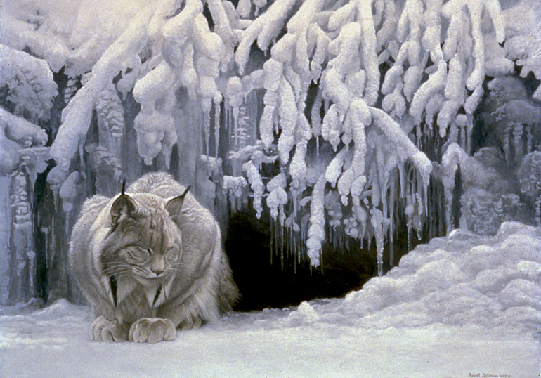 My painting shows the lynx in a late evening's tranquil moment at the entrance to a cave. It is at peace - lightly dozing prior to its night hunt. As I painted, I felt that the icicles and the lynx were like an oriental carving in alabaster or light jade.