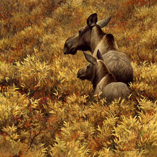 This cow moose and half grown calf were moving through a tapestry of fall colours in Denali Park. The yellow is dwarf willow and the red is dwarf birch.