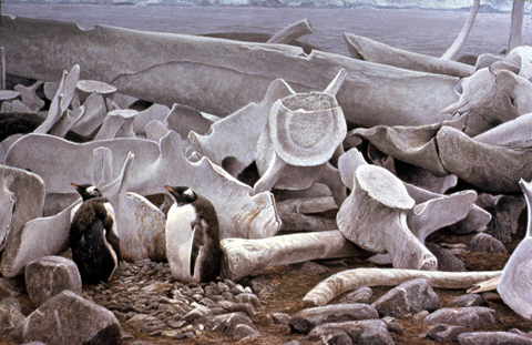 - The two gentoo penguins huddle among great wrecks of whale bones, colossal monuments that once were masters of the seas. The penguins give a sense of continuing life. They will soon take to the sea for the coming winter, but the great bones will stay as a testimony through the years.