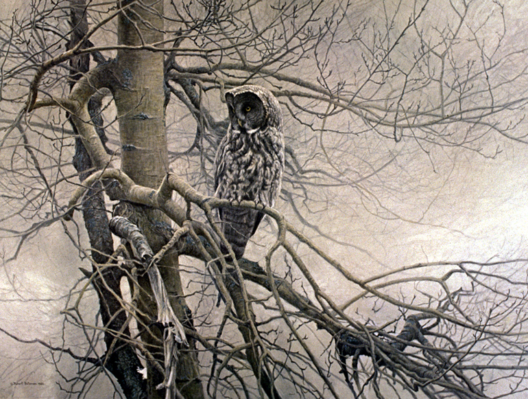 The great gray owl is truly a ghost of the north. It is fleeting and silent. Its wing feathers have downy edges, making its flight totally silent. The colours are subdued, and the patterns provide excellent camouflage.