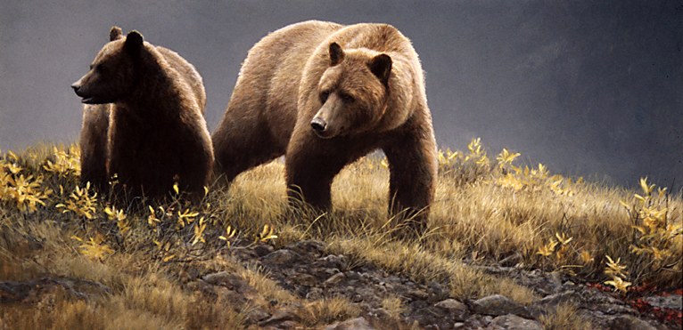 A mother and partly grown cub move along a ridge in the Alaskan autumn looking for berries, mice and grubs for the final feeding which is needed for the long hibernation.
