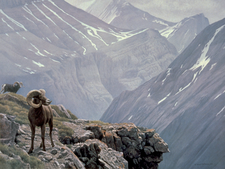 In this painting, I wanted to capture the breathtaking majesty of the domain of the stone sheep and to give a feeling of precariousness. They live in a world of precipitous cliffs. Though it almost never happens, there is always a possibility of a spectacular fall.