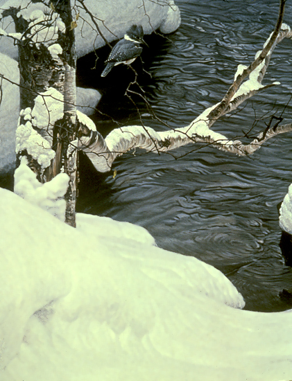 Strong, contrasting colours are the high cards to play in a painting. I use them very carefully and deliberately for the strongest effect. Although they are not usually thought of as winter birds, I chose a kingfisher for this painting. Kingfishers can often be seen in the snow, providing there is some open running water in winter where they can fish.