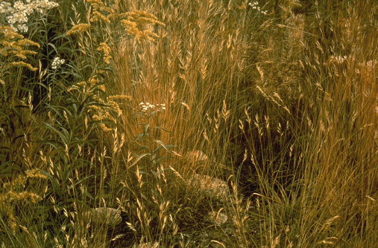 Most everyone, I'm sure, has enjoyed the childhood fantasy of being a tiny creature who has Lilliputian adventures in a world where ordinary things have become gigantic. Often I relive these fantasies when I'm painting a small complex piece of nature like this old meadow, now overgrown with goldenrod and everlasting. In working to convey the idea of air and space and depth around all these plants, I imagined that I was a field mouse running in and out through them or an insect buzzing around them. Although it is on a small scale, this is still a landscape and is based as much on rhythmic patterns and impressionist and cubist techniques as on meticulous detail.