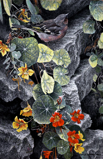 This old garden wall has been colonized by native lichens that gradually develop over decades. More recently an 'escaped' nasturtium has taken over the wall in a more flamboyant way. This is a plant that brings back many happy memories for me of summers in the country and the flower gardens of farmers' wives. With it go the sounds of cows and barn swallows and the smell of fresh milk and new-mown hay.