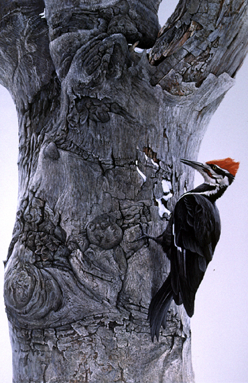 In this painting I have put him in a setting that is almost a sculptured landscape in itself . . . the trunk of the beech tree. I find the variety of surface textures like an exciting piece of abstract art.