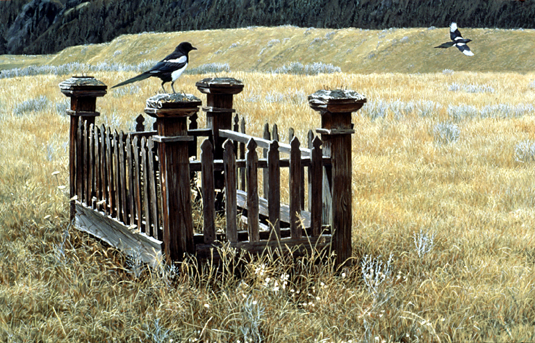 Here we have a little one-grave pioneer cemetery. The marker is gone; the name is forgotten. But still standing is the picket fence with its fancy pattern and elaborate corner posts. No one now visits the grave with bunches of flowers and wreaths. Nature has taken over with its organic decoration of native flowers and sagebrush. But even these seem to be appropriate like some Victorian dried garlands. The only visitors are the magpie pair who, in their black and white garb and with their intelligent ingenuity, seem to me to represent the spirit of the pioneers.