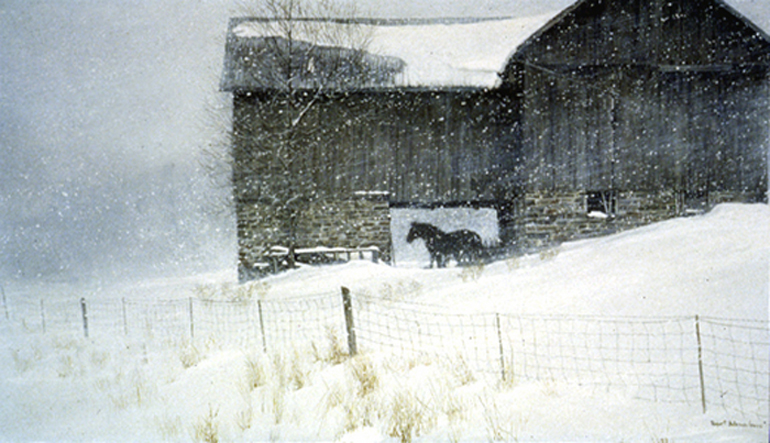 I recall seeing this scene during a driving blizzard. An old draft horse is patiently waiting out the storm.
