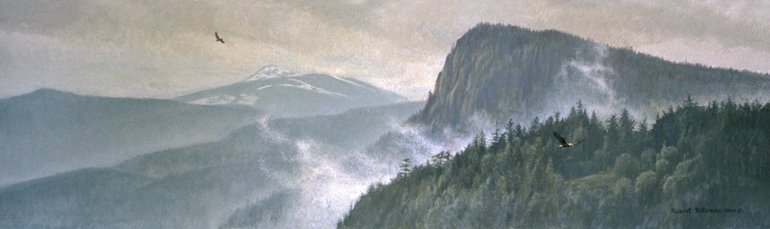 As I write this I am gazing out the studio window looking at the view in the late afternoon light and listening to J. S. Bachs Goldberg Variations transcribed from the original piano for chamber orchestra. I am thinking about how lucky I am . . . lucky to have Birgit and the other people around me . . . to have my daughter Sarah, her husband Rob and our two granddaughters living over the hill about 10 minutes away. I am also very lucky to be living in a very charming, natural setting. The mountain in my view is called Mount Maxwell, not very high (just under 2000 feet) as mountains go. However, because of its steepness, it does have a certain topographic distinction. It is the subject of this painting, which was originally done for the jacket of my latest book Thinking Like a Mountain.