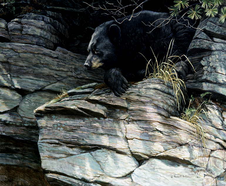 I have placed this bear in a benign mood resting under the shelter of a pine. They are not very active during sunny part of the day, but this one has chosen the top of a rocky cliff so that he can glance around in case anything interesting happens. These rocks are part of the pre-Cambrian shield and are a particular place I have known since childhood. I enjoyed the interplay of geological texture, dappled sun and shadow.