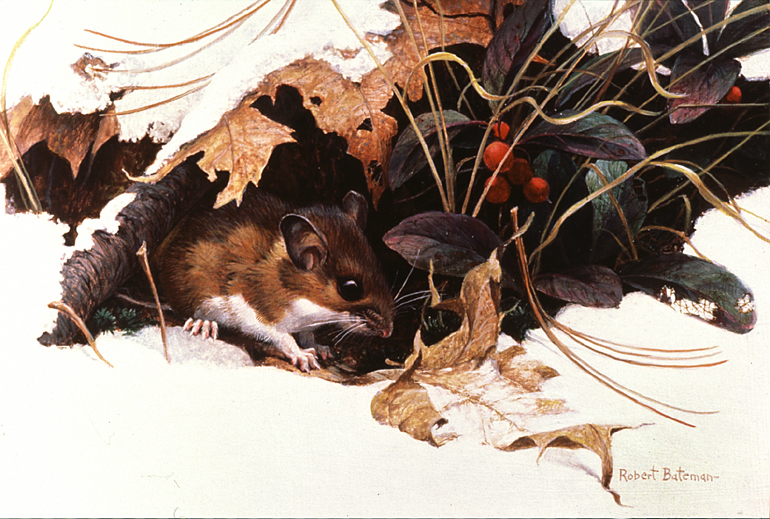 This mouse is a fully mature adult in his two-tone brown and white. He is where he belongs, in the woods. The entrance to one of his burrows is graced with a clump of fragrant wintergreen