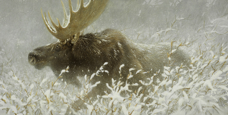 - This moose has been browsing his way through a willow swamp. The gentle snow of the night before has settled on every little twig. In fact, a few flakes are still falling, creating a counterpoint of delicate white tracery against the powerful planes of the moose's form. The tranquility of this scene is short-lived, however. For some reason, the bull moose decides to charge in my direction. At the very last moment he veers off, giving me a baleful glance as he thunders past.