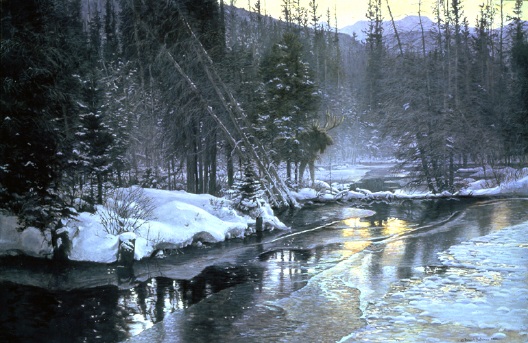In this painting I have shown a bull moose about to cross a beaver dam in early winter. The pond has not yet frozen. Although the sun has set, there is a glow in the sky which, in this case, shows mostly in the water. Besides portraying a mood of time and place, the interesting challenge, for me, was to show the textures and colours of the water, ice and snow. They are all H2O, yet their physical properties do different things with light.