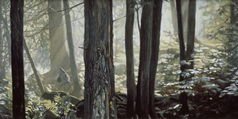 Grouse country is beautiful country, and drumming season is a beautiful time of year. This scene is actually near our house, a favourite corner of the woods. As in most of my pictures, I reconstruct a moment which could have happened. I did not actually see a grouse at that exact spot. I tried to create the atmosphere of a lustrous spring day -- tranquil, yet rich with energy and life.